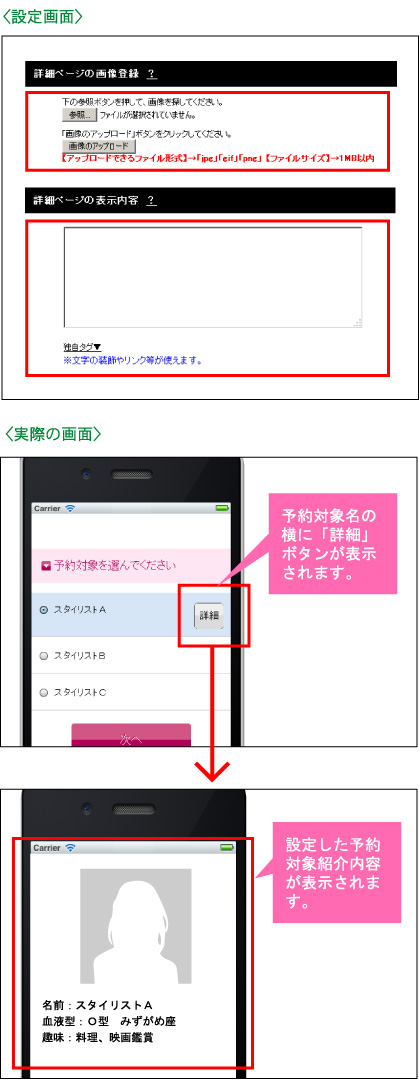 機能一覧 詳細ページ(予約対象) スタッフや講座などのプロフィールや詳細な内容の画像や案内文を表示することができます。 お客様が予約される際に、予約内容をわかり易く伝えることができます。 予約対象の詳細ページ スタッフや講座など予約対象の紹介ページの設定が可能です。 まずは使ってみてください! 予約システム利用までの流れ ご利用店舗様 お客様の声 代理店制度 FAQ セキュリティーへのこだわり 初心者の方にもやさしい安心サポート