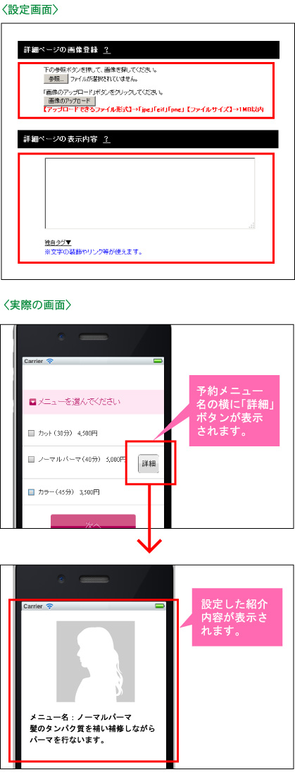 機能一覧 詳細ページ(予約メニュー) 予約メニューの詳細な内容や画像を表示することができます。お客様が予約される際に、予約内容をわかり易く伝えることができます。 予約メニューの詳細ページ 予約メニューの紹介ページの設定が可能です。 まずは使ってみてください! 予約システム利用までの流れ ご利用店舗様 お客様の声 代理店制度 FAQ セキュリティーへのこだわり 初心者の方にもやさしい安心サポート