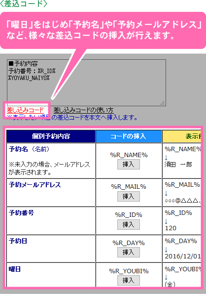 自動返信メール本文内に「予約名」や「予約メールアドレス」などが表示されるようになる「差込コード」が挿入できます。