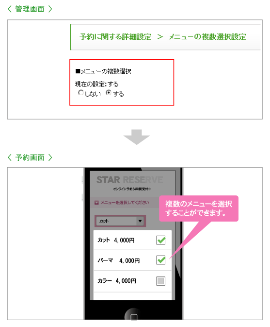 機能一覧 予約メニュー複数選択 メニュー選択時に「カット+カラー+パーマ」という風に、一度の予約で複数のメニューを選択することが可能です。 まずは使ってみてください! 予約システム利用までの流れ ご利用店舗様 お客様の声 代理店制度 FAQ セキュリティーへのこだわり 初心者の方にもやさしい安心サポート
