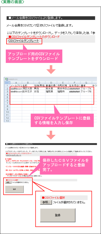 ※一括登録できる内容は、「メールアドレス」「名前」「都道府県」「市町村等」「生年月日」「備考」になります。その他会員情報を登録することも可能です。