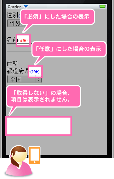 また、それぞれの取得項目に対して、「必須で取得」「任意で取得」「取得しない」を設定することが可能です。