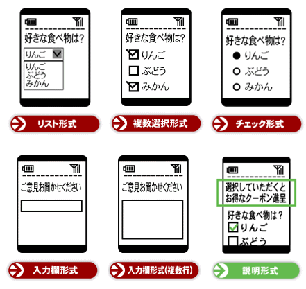 ■「リスト形式」「複数選択形式」「チェック形式」「入力欄形式」など、用途に合わせて質問形式をお選びいただけます。