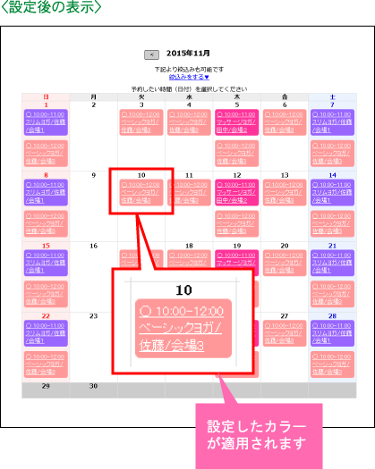 例えば:スクールなどの場合、レッスンA、レッスンBなどに予約内容が分かれている場合、各レッスンを色分けすることで日程がちがっていても共通のレッスンであることがひと目でわかります