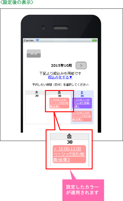 PCと同様に、各予約対象で設定したカラーで表示されます。