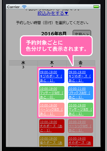 各予約対象で設定したカラーでそれぞれの予約が表示されます。