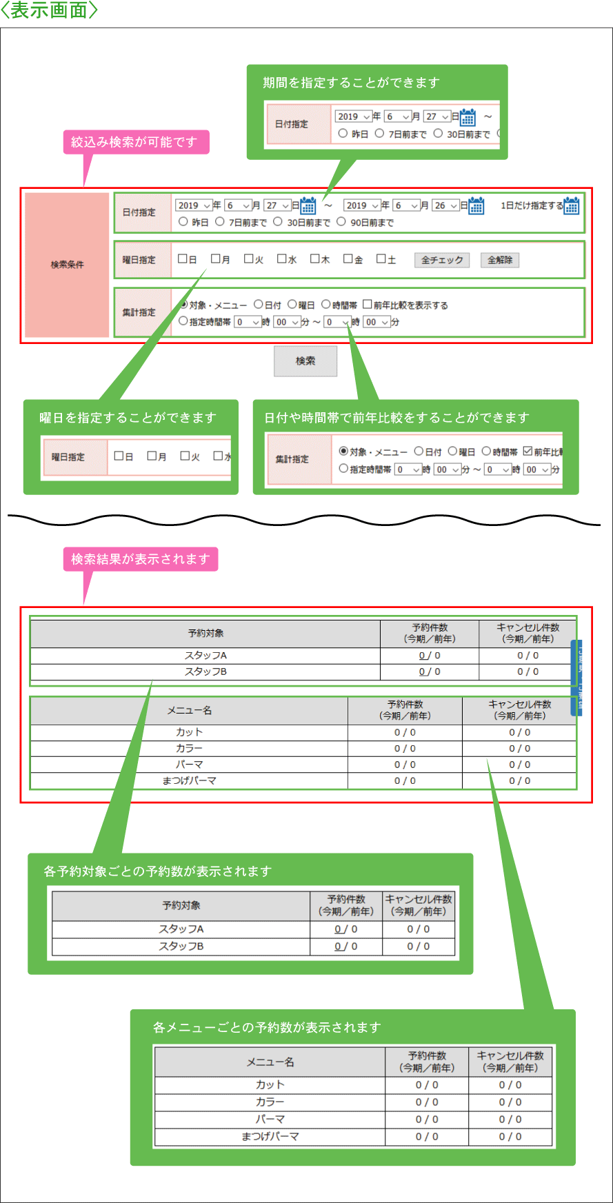 機能一覧 予約の集計結果 各予約対象の「予約数」「キャンセル数」、メニューごとの「予約数」「キャンセル数」が表示されます。特定の期間や、曜日で絞込んでの結果表示も可能です。また予約数の前年比較を表示することも可能です。 まずは使ってみてください! 予約システム利用までの流れ ご利用店舗様 お客様の声 代理店制度 FAQ セキュリティーへのこだわり 初心者の方にもやさしい安心サポート