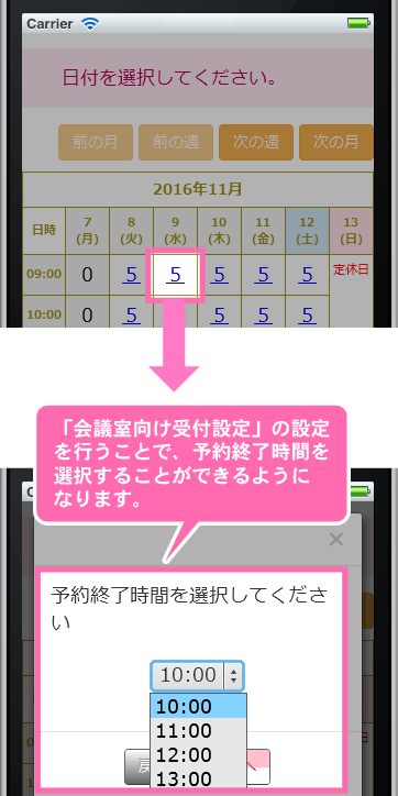 「会議室向け受付設定」とは、お客様が予約の開始時間と終了時間を自由に選択できる機能です。