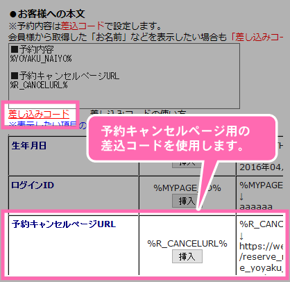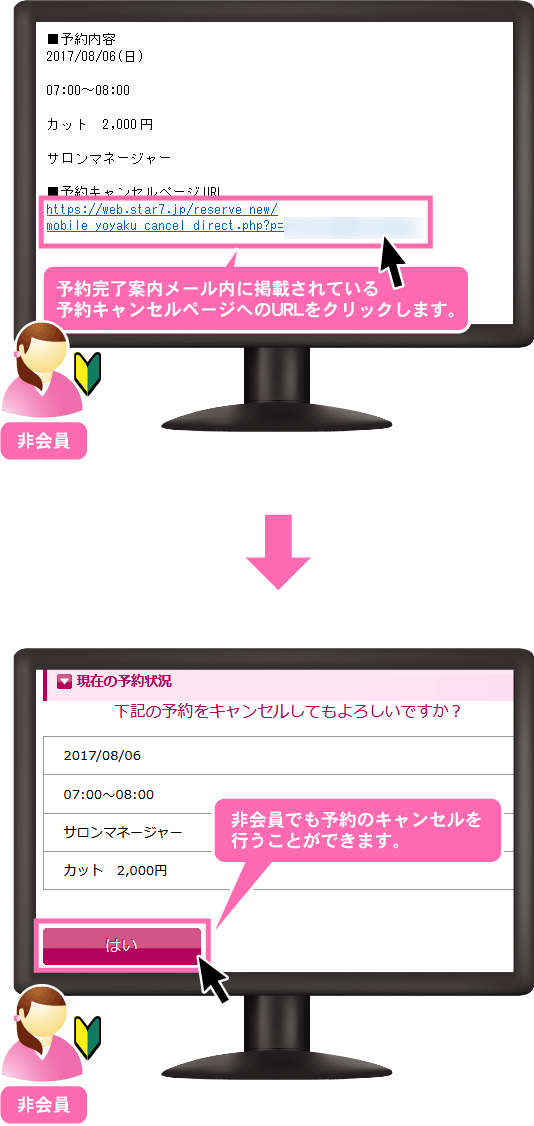 機能一覧 非会員でもキャンセルできる機能 予約完了メール本文中に非会員用の予約キャンセルURLを記載することで、非会員でも予約のキャンセルが行えるようになります。 予約完了メール 予約完了時に非会員の予約者へ自動で送られるメールです。 差込コード 予約キャンセルページURL用の差込コードを使用して、非会員でも予約キャンセルが行えるようにします。 まずは使ってみてください! 予約システム利用までの流れ ご利用店舗様 お客様の声 代理店制度 FAQ セキュリティーへのこだわり 初心者の方にもやさしい安心サポート