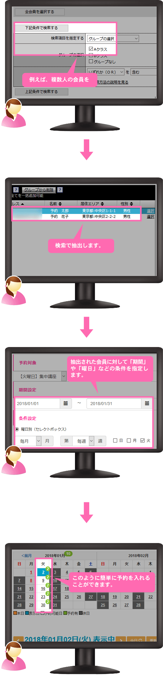 例えば、「英会話初級クラス」の会員様に定期予約を入れたいという場合、「英会話初級」グループを作成して会員様を振り分けます。後は検索時に「英会話初級」グループを選択するだけでそのグループに属する会員様を検索することができます。
