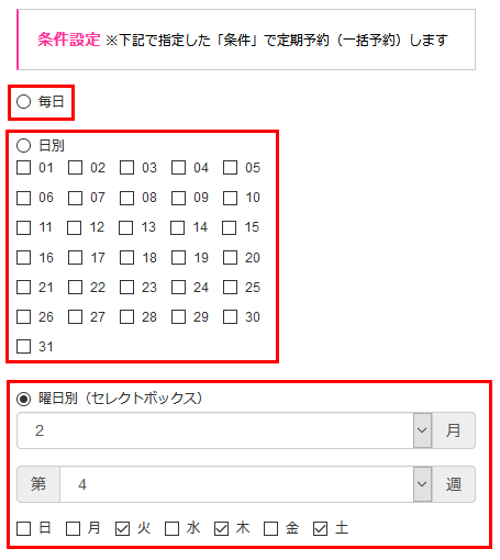 ・予約を入れたい期間や曜日、日付(例:1月〜2月の金曜日)などを選択します。