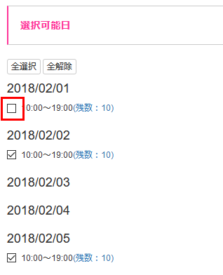 表示された日付けの中から、予約を入れたくない日があればチェックを外して予約を入れないようにする事も可能です。