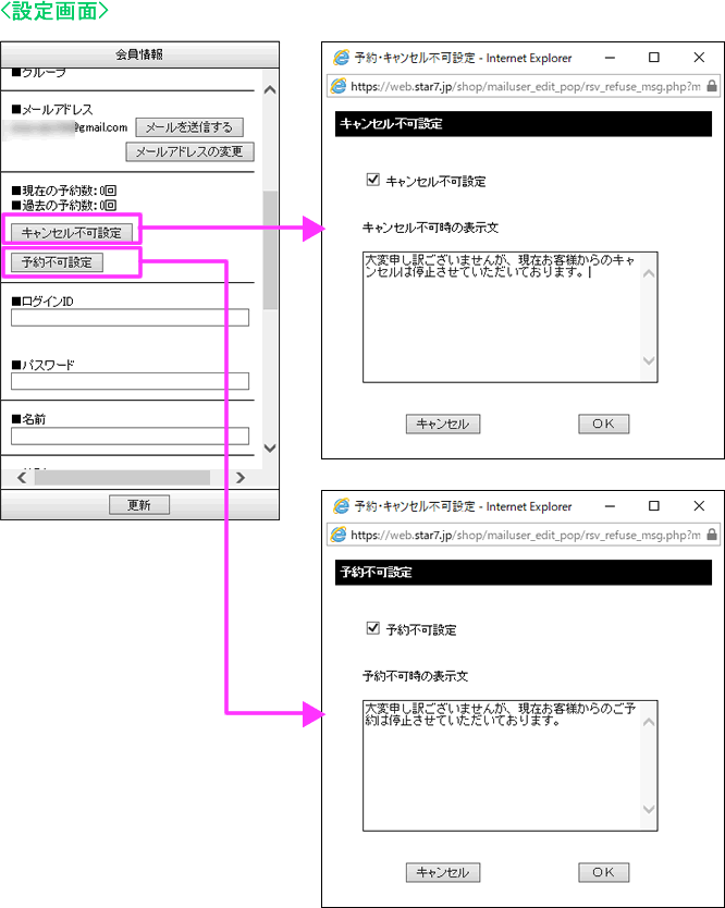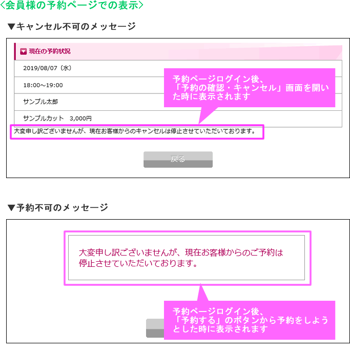 ・予約不可、キャンセル不可の設定をしたときに、会員様側に表示されるメッセージを自由に設定できます。