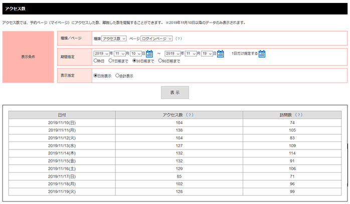 マイページ(予約ページ)のアクセス数を日別や期間別に確認することができます。