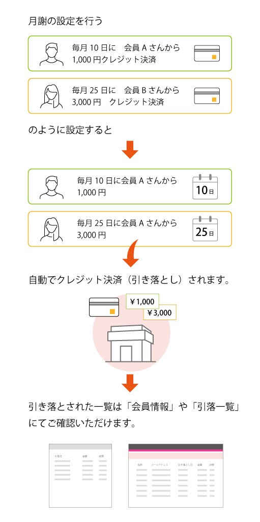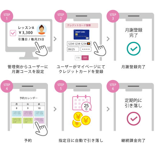スターリザーブの管理画面からユーザーに月謝の設定を行い、ユーザーがマイページにて、月謝のクレジットカード登録を行うと、設定した日に毎月自動で引き落としが行われます。