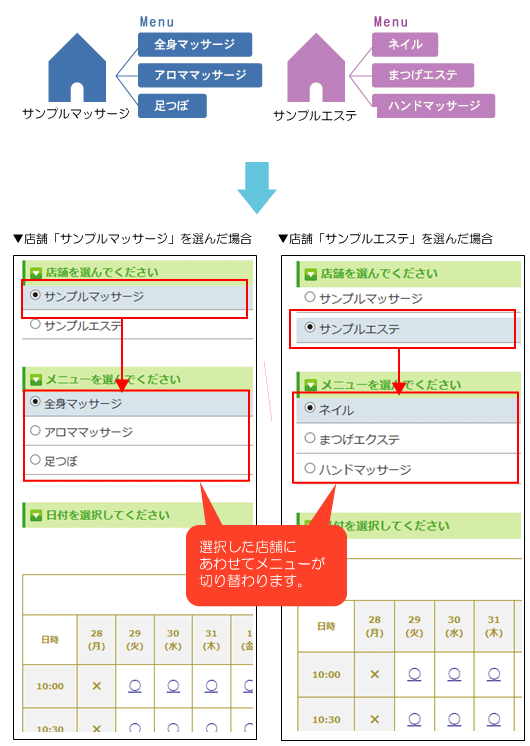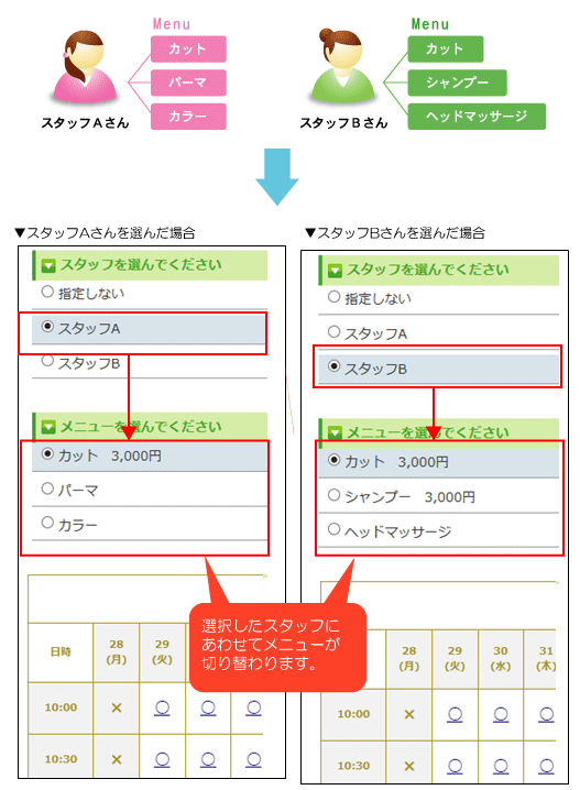機能一覧 対象ごとに表示するメニューを変更 対象ごとに表示されるメニューを変更することが出来ます。 スタッフごとに施術メニューが違う場合、お店ごとに提供しているサービスが違う場合などに便利な機能です。 スタッフごとに表示メニューを変更する場合のイメージ お店ごとに表示メニューを変更する場合のイメージ まずは使ってみてください! 予約システム利用までの流れ ご利用店舗様 お客様の声 代理店制度 FAQ セキュリティーへのこだわり 初心者の方にもやさしい安心サポート