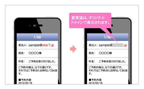 会員登録時の空メールアドレスやメール配信時のアドレスを、弊社の「∗∗∗∗@star7.jp」ではなく、お客さま所有のオリジナルドメインに変更することができます。