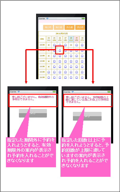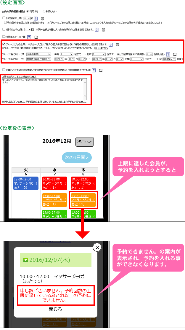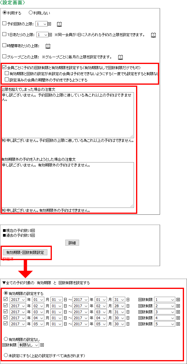 また、有効期限と回数の設定が未設定の会員に対し予約ができないようにすることや、設定済みの会員の期間外の予約ができるようにすることも可能です。