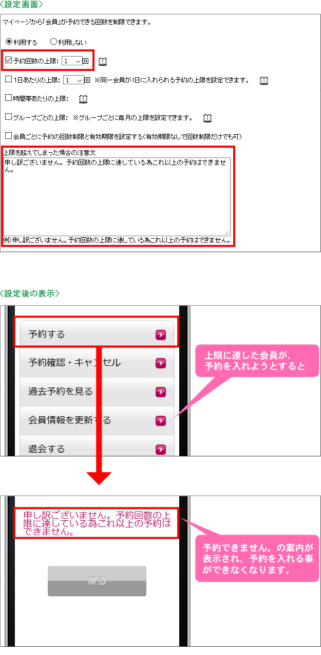 「予約回数の上限」「1日あたりの上限」「時間帯あたりの上限」「グループごとの上限」「会員ごとに予約の回数制限と有効期限を設定する」から選んで設定できます。
