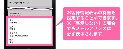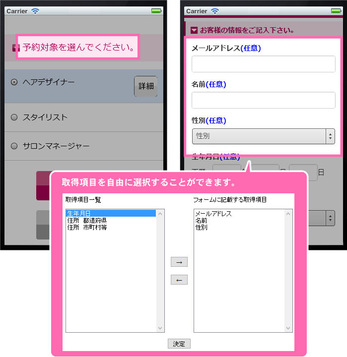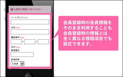 各項目選択画面のタイトル設定や会員情報の取得項目設定、質問項目などのを行うことができます。