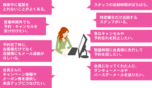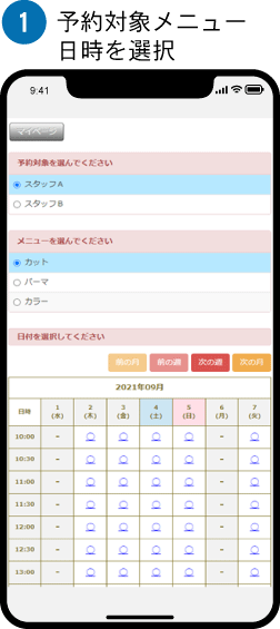 業種別活用例 スクール・教室の場合 美容室・サロンの場合 その他の場合 業種別活用例 2.美容室・サロンの場合 予約の流れ 1予約メニューを選択 2ログイン 3予約内容確認 4予約完了 予約画面イメージ << 前の画面へ 次の画面へ >> 対応業種 美容室、サロン、エステ、整体、診療 対応可能なスケジュール例 美容室の場合 よくある要望 まずは使ってみてください! 予約システム利用までの流れ ご利用店舗様 お客様の声 代理店制度 FAQ セキュリティーへのこだわり 初心者の方にもやさしい安心サポート